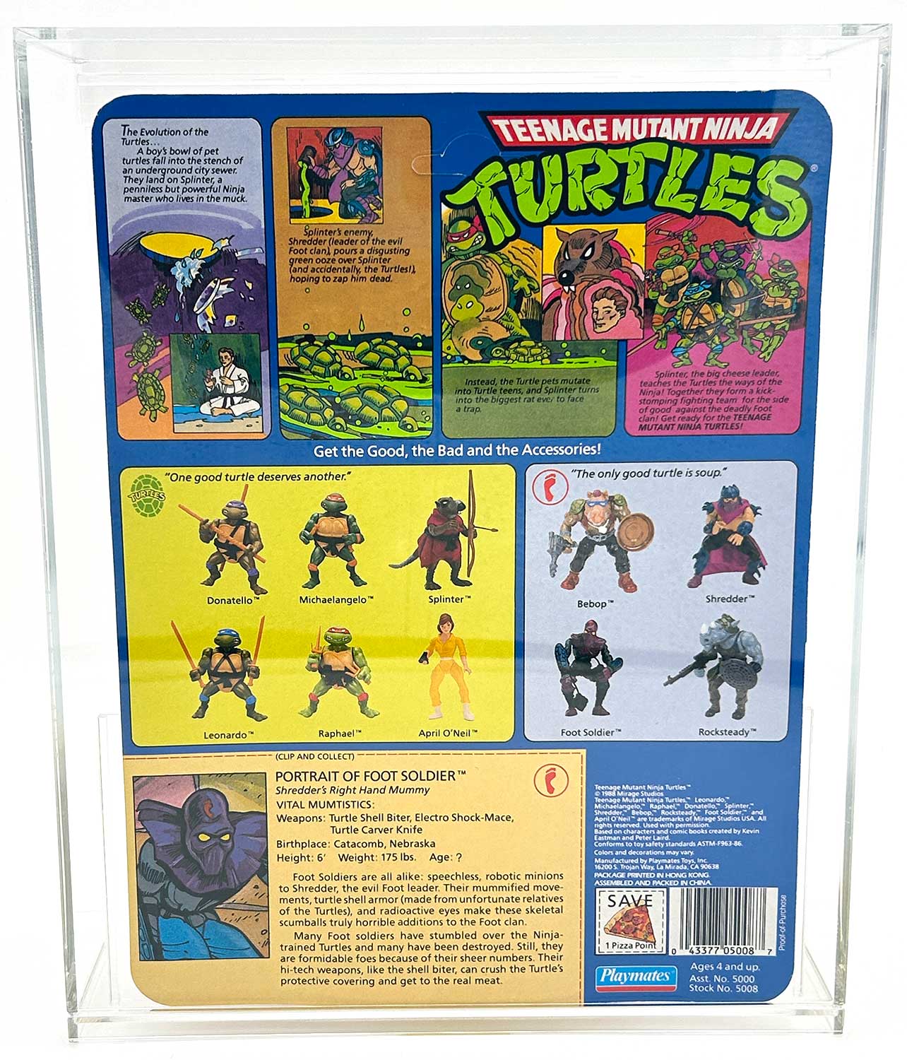 This is one VERY RARE Find! Coming directly from Kevin and Peter, this Playmates figure is housed in an AFA hard acrylic case, ideal for taking center place in your vintage TMNT Toy Collection. The card back and blister pack remain intact and unpunched.