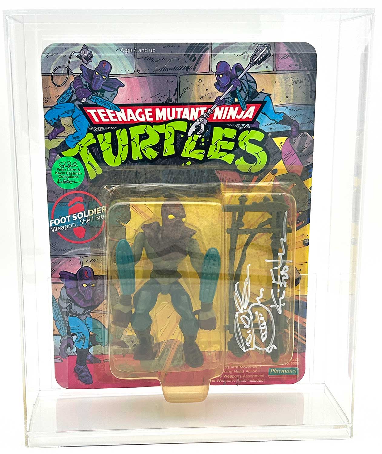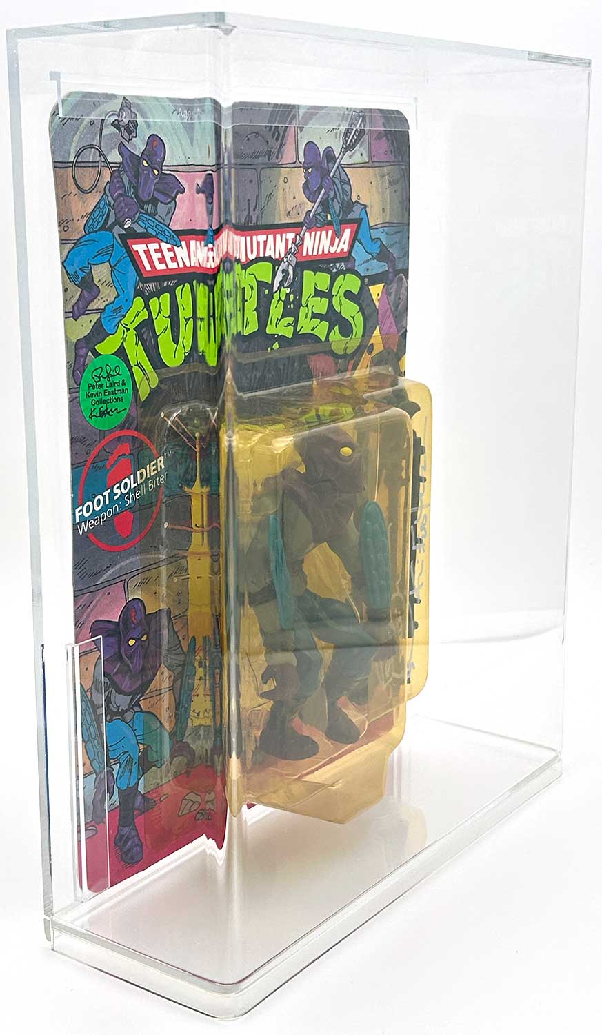 From the Personal Collection of Peter Laird and Kevin Eastman, creators of the Teenage Mutant Ninja Turtles, this vintage Foot Soldier also features a signature and remarque by Kevin Eastman and a Hologram Label of Provenance on the backer card.