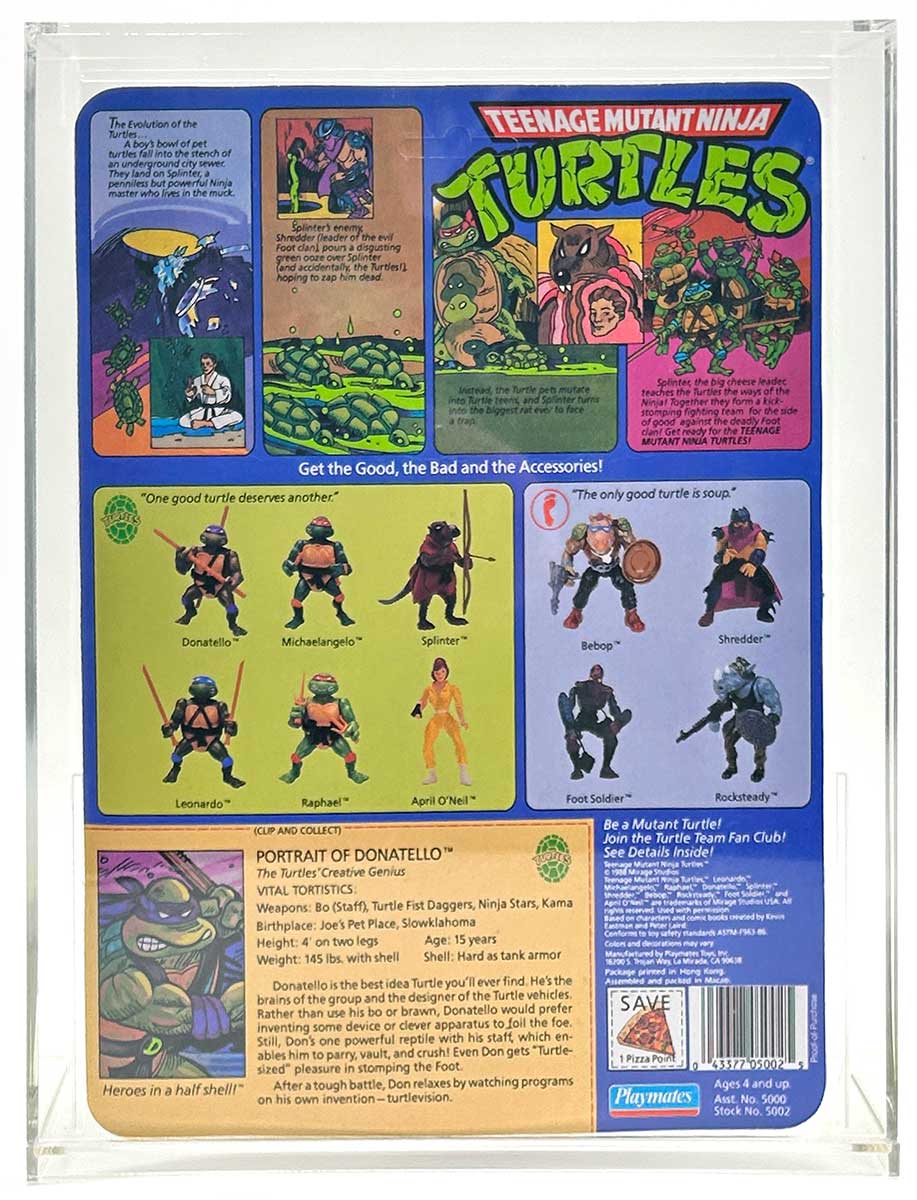 This is one VERY RARE Find! Coming directly from Kevin and Peter, this Playmates figure is housed in an AFA hard acrylic case, ideal for taking center place in your vintage TMNT Toy Collection. The card back and blister pack remain intact and unpunched and the vintage Fan Club Flyer is showcased behind the weapons rack.