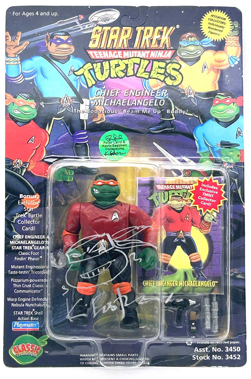 From the Personal Collection of Peter Laird and Kevin Eastman, creators of the Teenage Mutant Ninja Turtles, this vintage 1994 Star Trek Chief Engineer Michaelangelo also features a signature and remarque by Kevin Eastman and a Hologram Label of Provenance.