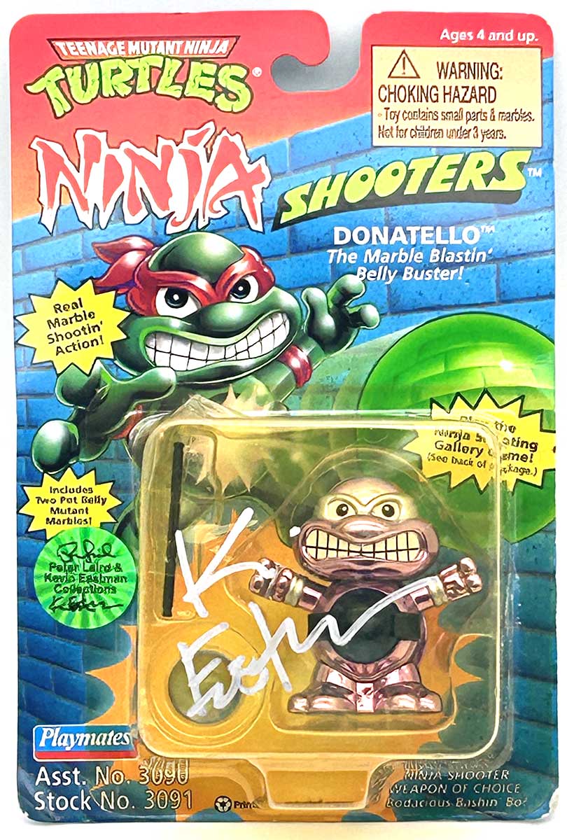 From the Personal Collection of Peter Laird and Kevin Eastman, creators of the Teenage Mutant Ninja Turtles, this vintage Playmates Ninja Shooter Donatello: The Marble Blastin’ Belly Buster also features a signature and remarque by Kevin Eastman and a Hologram Label of Provenance on the box.”
