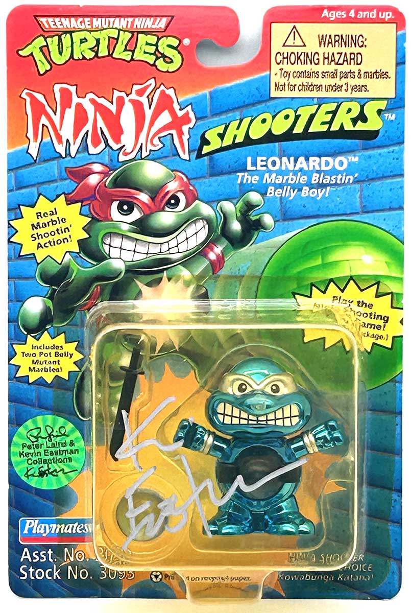 From the Personal Collection of Peter Laird and Kevin Eastman, creators of the Teenage Mutant Ninja Turtles, this vintage Playmates Ninja Shooter Leonardo: The Marble Blastin’ Belly Boy also features a signature and remarque by Kevin Eastman and a Hologram Label of Provenance on the box.”