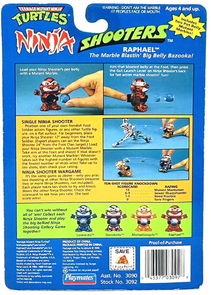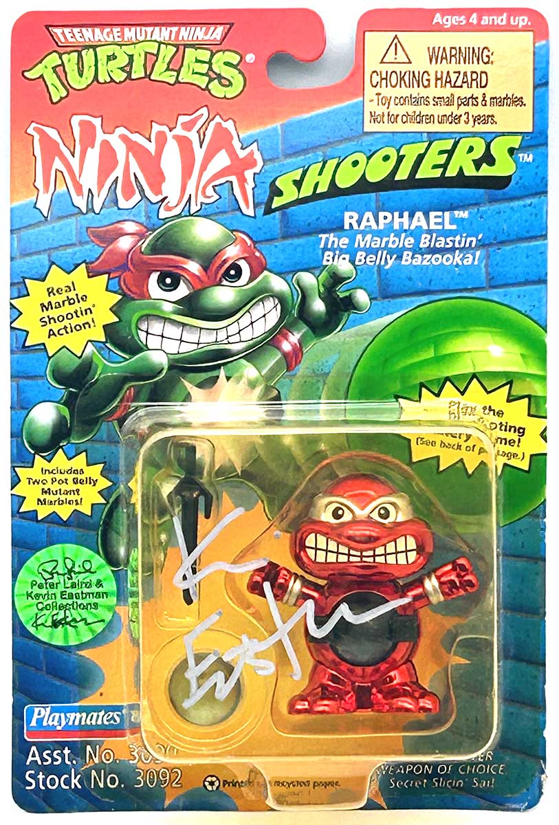 From the Personal Collection of Peter Laird and Kevin Eastman, creators of the Teenage Mutant Ninja Turtles, this vintage Playmates Ninja Shooter Raphael: The Marble Blastin’ Belly Bopper also features a signature and remarque by Kevin Eastman and a Hologram Label of Provenance on the box.”