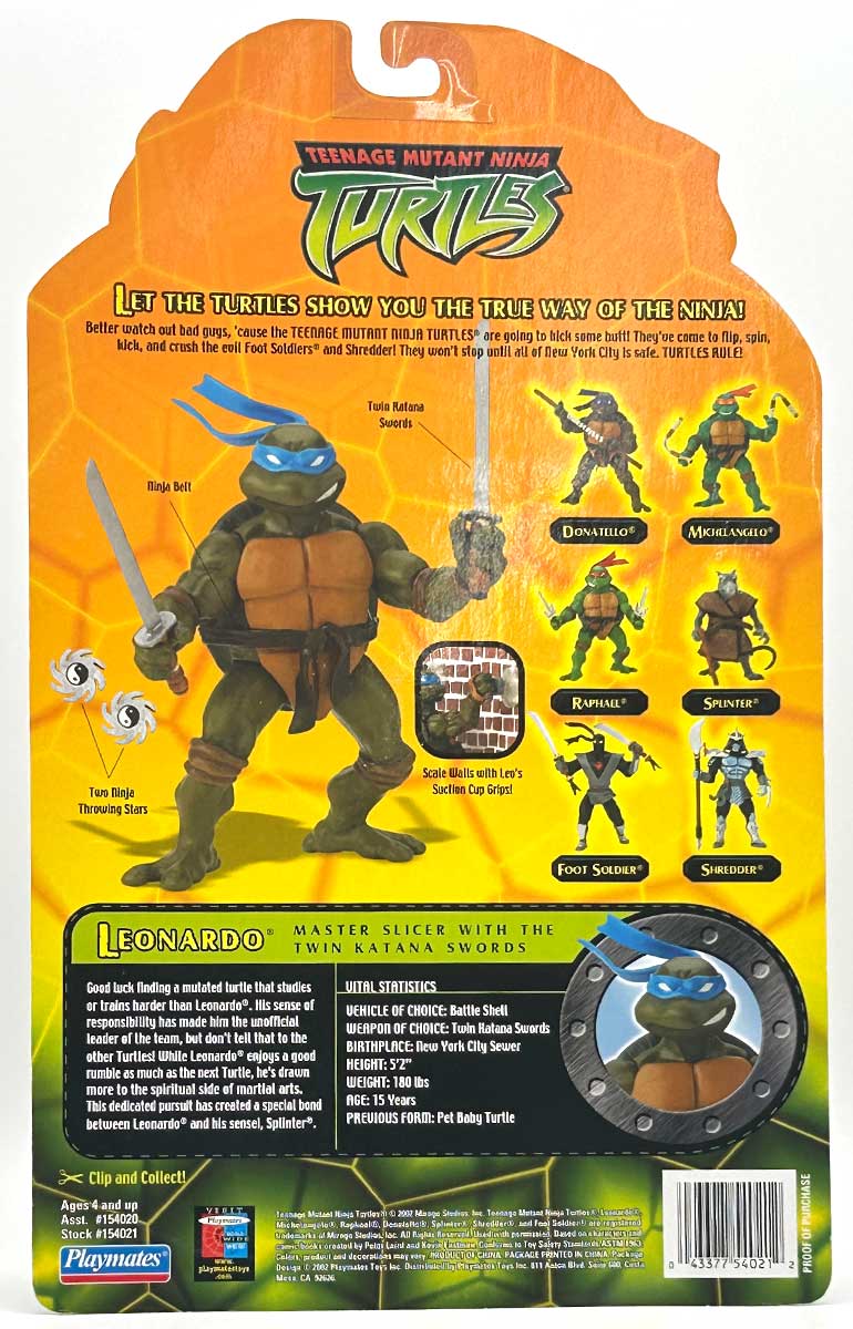 This 2002 Leonardo was sent directly to Mirage Studios (Publishers of the Teenage Mutant Ninja Turtles) by Playmates Toys and has been housed in the Personal Collections of Peter Laird and Kevin Eastman, the co-creators of the Teenage Mutant Ninja Turtles since then.