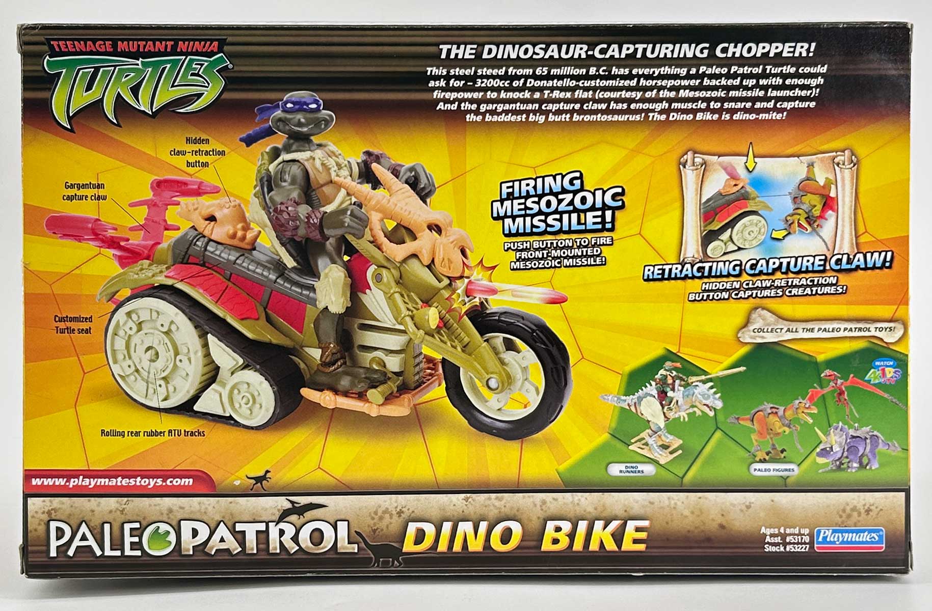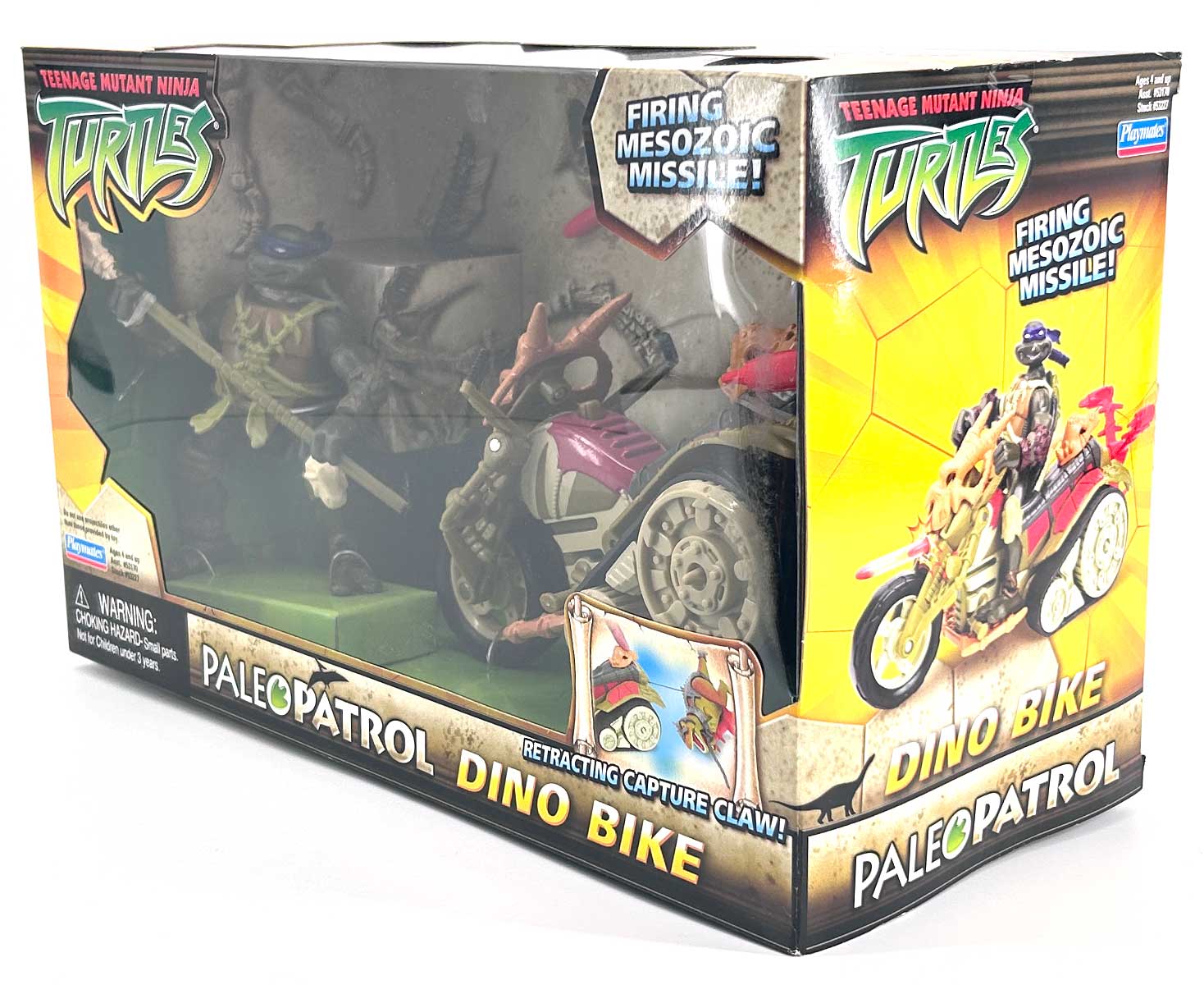This steel steed from 65 million B.C. has everything a Paleo Patrol Turtle could ask for – 3200cc of Donatello-customized horsepower backed up with enough firepower to knock a T-Rex flat (courtesy of the Mesozoic missile launcher)! And the gargantuan capture claw has enough muscle to snare and capture the baddest big butt brontosaurus! The Dino Bike is dino-mite!