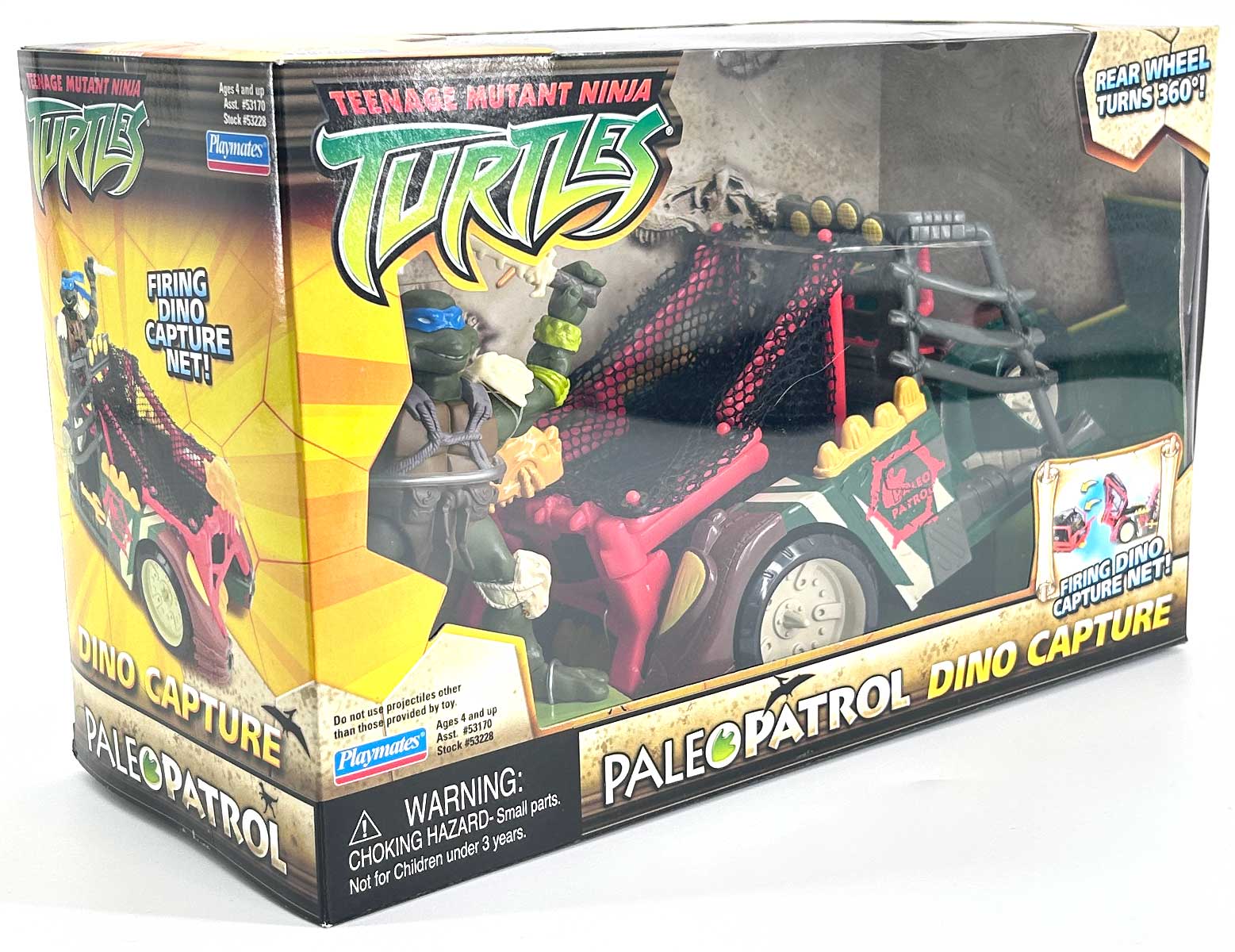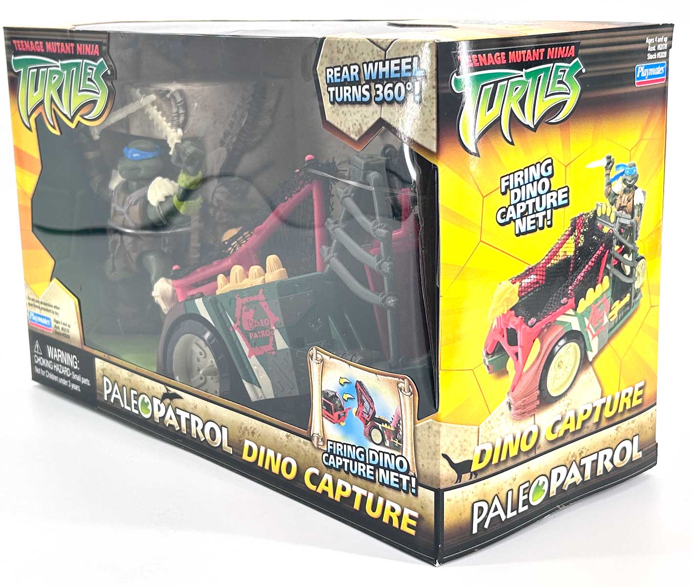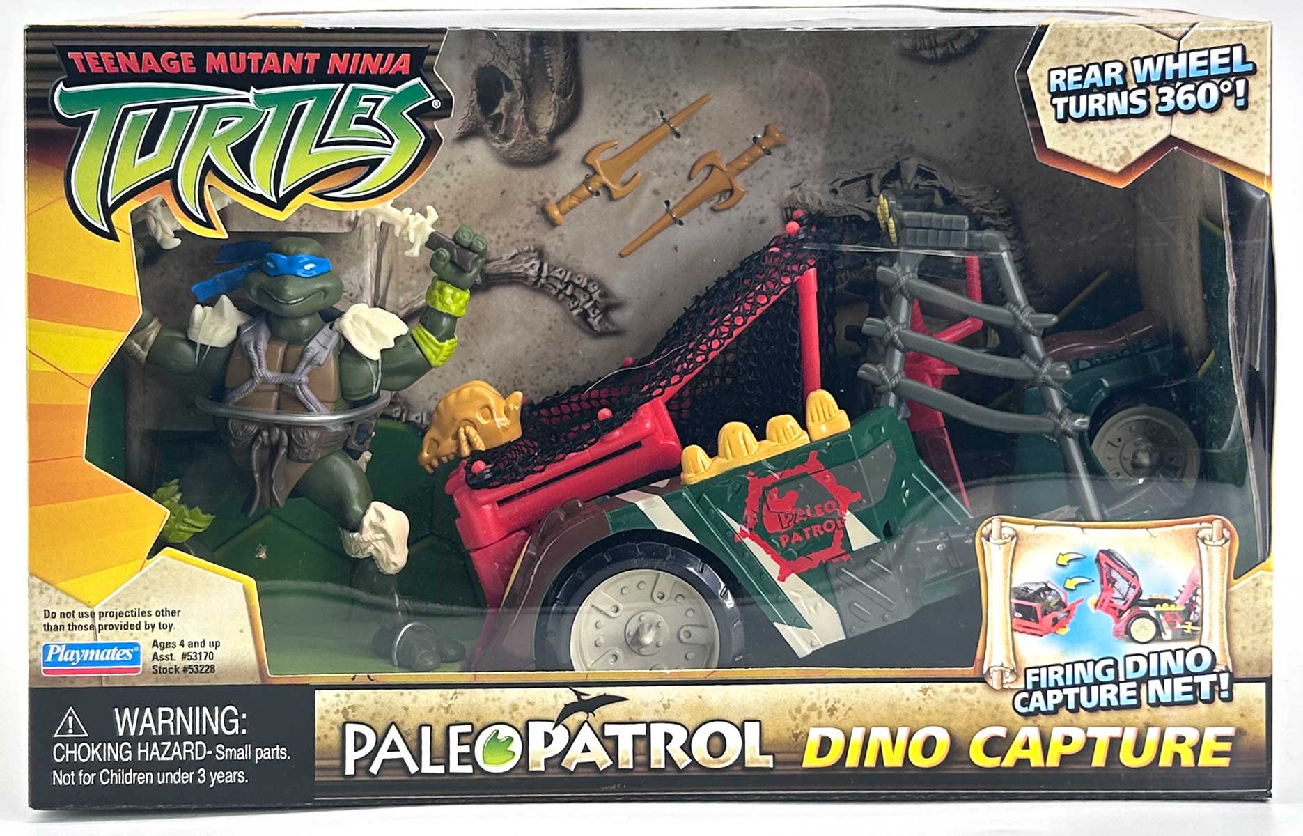 It took a lot of muscle power and a few well-placed rock-tipped weapons, but the Paleo Patrol Turtles finally have all the rampaging dinos cornered! Now all they gotta do is capture them for transport back to TMNT Cretaceous headquarters! Good thing Donatello’s been keeping busy. With a car engine, sticks, stones and bones, everyone’s favorite tyrannosaur topplin’ terrapin built the Dino Capture vehicle with its button-activated net launcher!