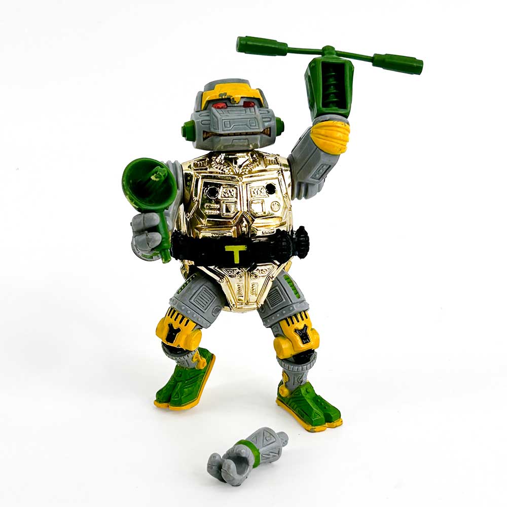 Designed as Krang’s ultimate weapon against the Turtles, Metalhead was re-programmed by Donatello to serve the side of good. This chrome-plated sewer servant’s eyes light up when you hold him up to the light. Always the life of the party, Metalhead can whip up a whipped cream and jelly bean pizza, serve sodas, display video games or rock the sewers with tunes from his jazzed-up juke box.