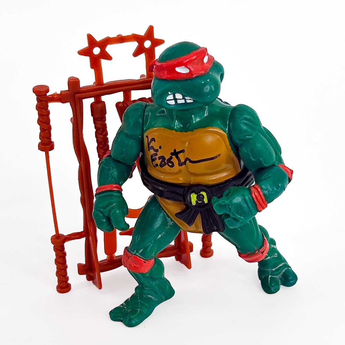 I was born in 1987. I watched the cartoon, and I love the first film. I remember going to see “Secret of the Ooze” in theaters. I had the Michaelangelo action figure as well as the other turtles back in the day. Unfortunately, I no longer have my collection, so I looked to Ebay. I wasn’t very happy about the prices there… I learned of Kevin Eastman’s website through Facebook. When I saw Michaelangelo, I knew I had to have him. Some people will think $99 is a lot, but look at what they go for on Ebay… Seriously, getting Kevin Eastman’s signature on a vintage toy with the certified card back for this price is a deal! I love the nunchakus that came with this. They are not the one’s that were included in the Playmates release. I’m pretty sure Mr. Eastman made them himself. That is so cool! By the way, they work really well. Yes, I played with the toy! I’m giving this a 5 star rating because it was shipped to me as priority mail and arrived 3 days after I placed my order. Also, Mr. Eastman included a Topp’s TMNT collector’s card as an added bonus. I wasn’t expecting that at all. Thank you, Mr. Eastman.