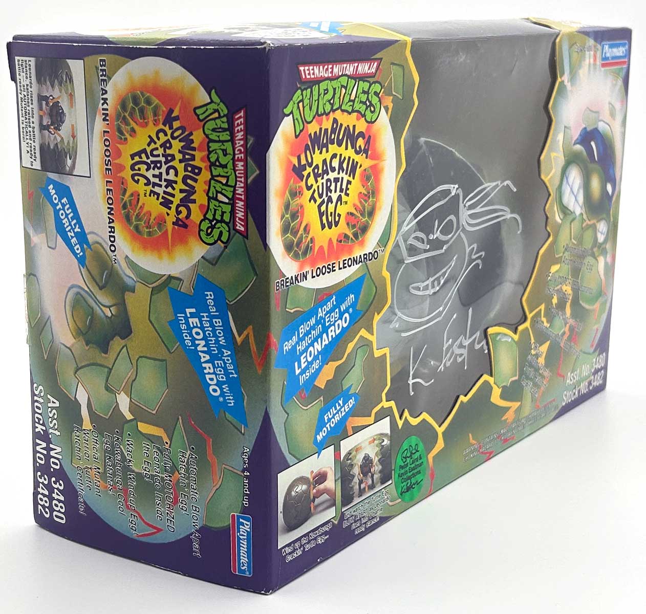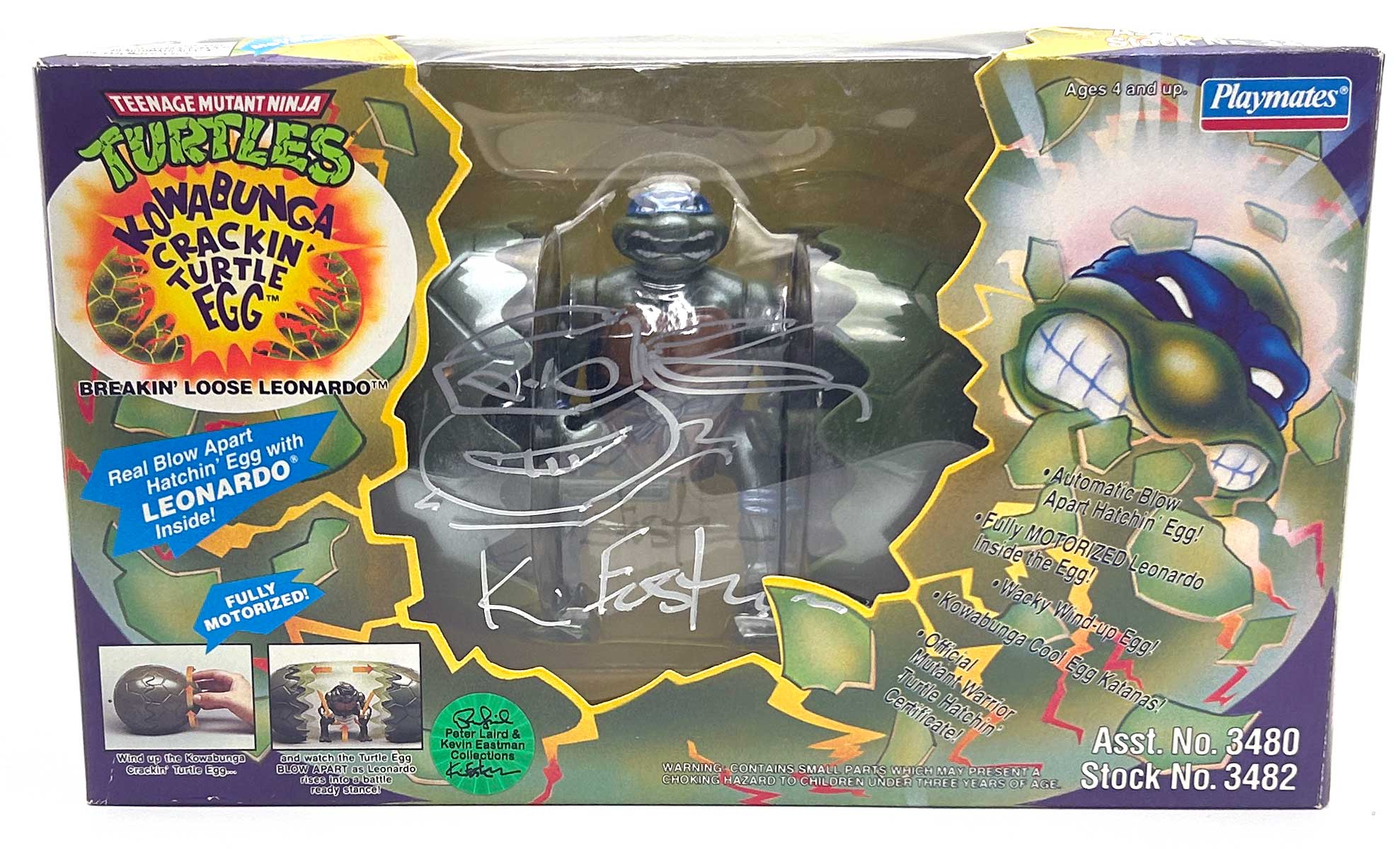 From the Personal Collection of Peter Laird and Kevin Eastman, creators of the Teenage Mutant Ninja Turtles, this vintage Crackin Turtle Egg Leo also features a signature and remarque by Kevin Eastman and a Hologram Label of Provenance on the backer card.