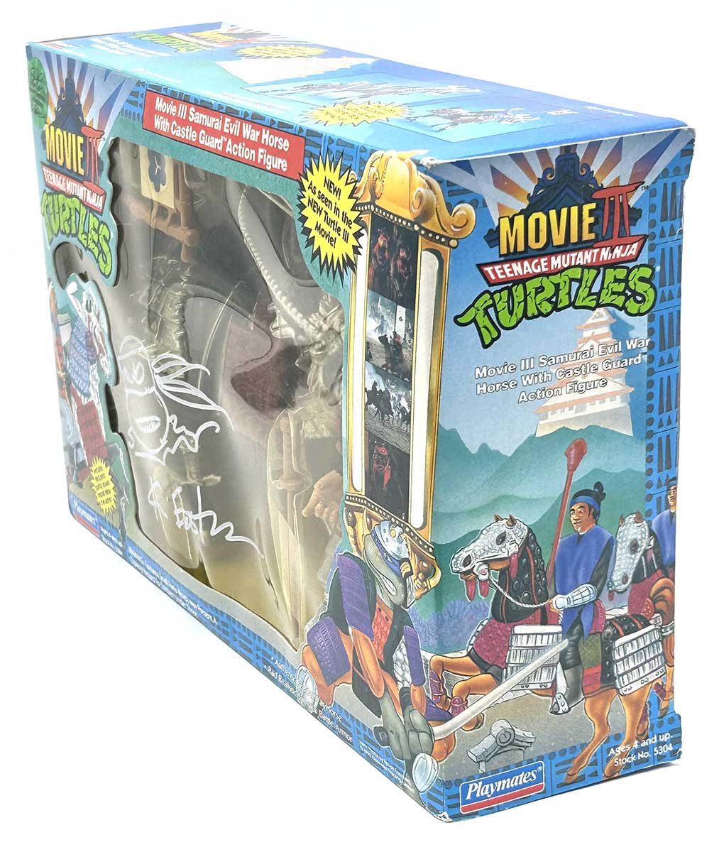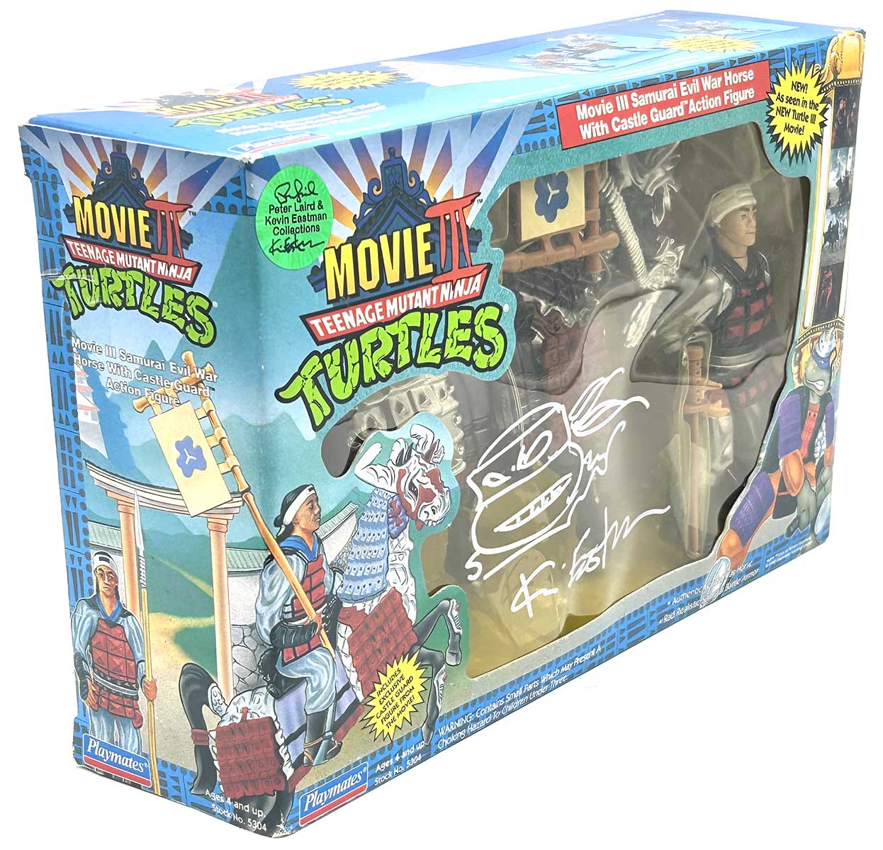 From the Personal Collection of Peter Laird and Kevin Eastman, creators of the Teenage Mutant Ninja Turtles, this vintage Playmates TMNT Movie III Samurai Evil War Horse with Castle Guard Action Figure also features a signature and remarque by Kevin Eastman and a Hologram Label of Provenance on the box.