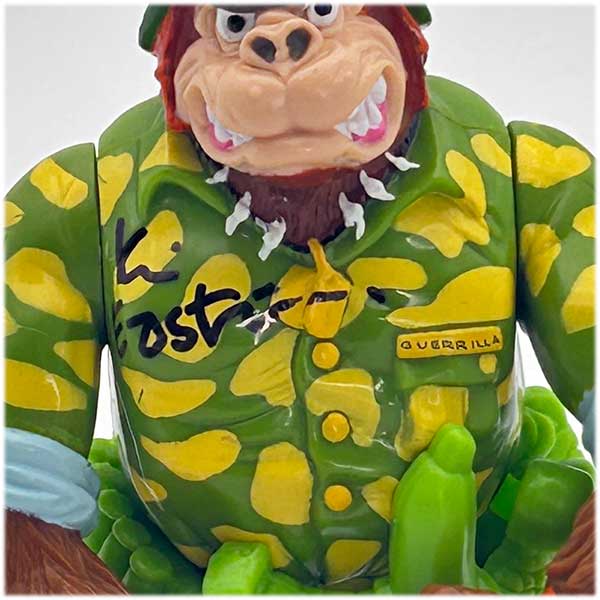 Maybe he’s goin’ coconuts; maybe he’s goin’ ape-but for sure, he’s bananas-Sergeant Bananas, that is! This crazed critter of the Congo’s got the mutant muscle of a million monkeys! And he’s ready to wreak havoc on the Foot Clan. All because Shredder slopped Retromutagen Ooze over his jungle gym. After wandering through the muck, this soldier of misfortune mutated with a hairy gorilla. Now he’s a gorilla guerilla. Or is that guerilla gorilla?