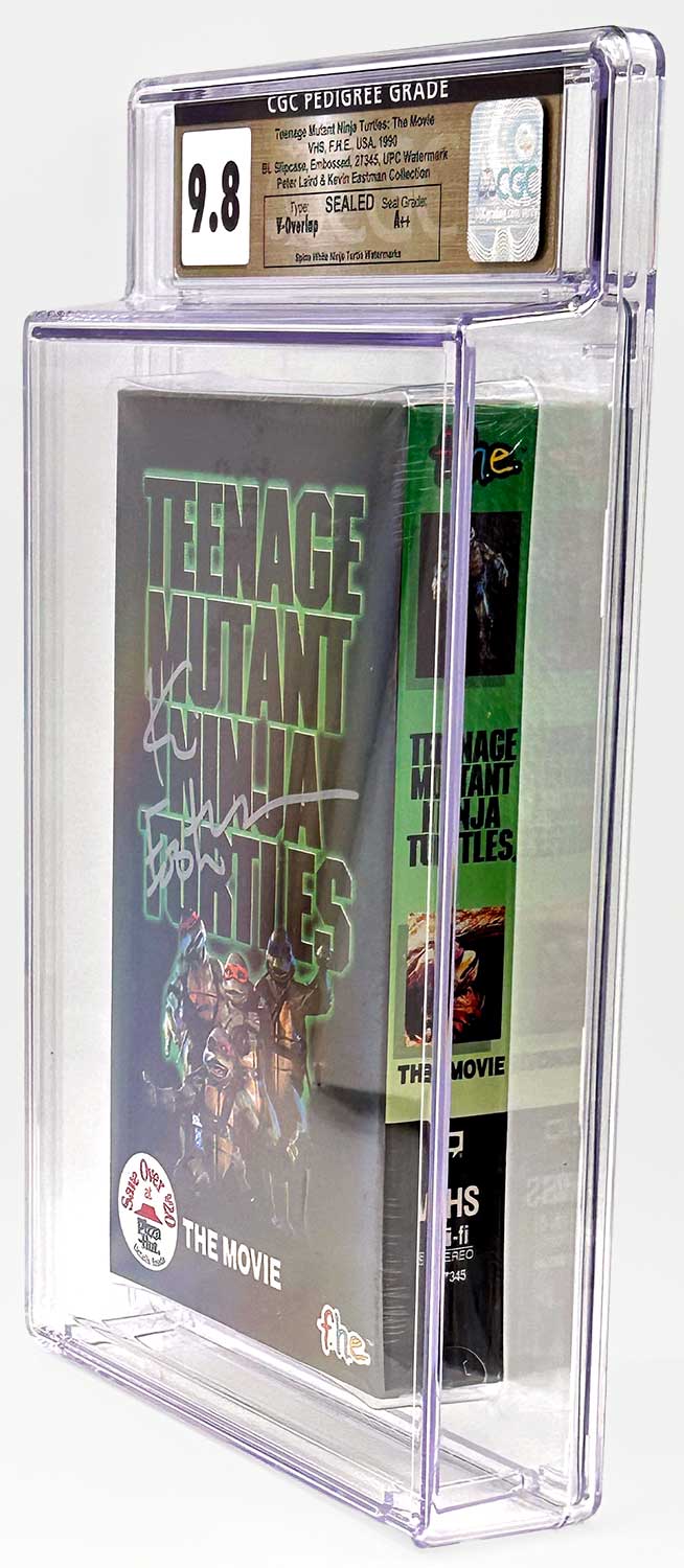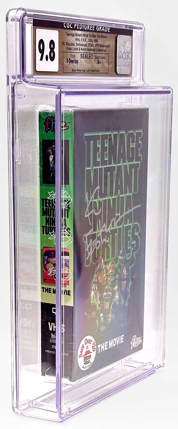 A factory sealed VHS copy of Teenage Mutant Ninja Turtles: The Movie, preserved in CGC 9.8 condition and certified as part of a Pedigree Collection from the personal archives of Peter Laird and Kevin Eastman.
